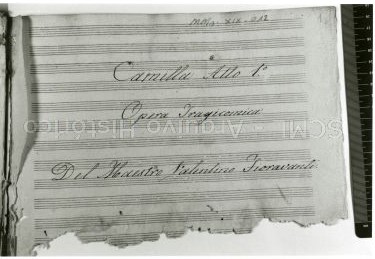 [Plano da folha de rosto do manuscrito "Ópera Camilla" de Valentino Fioravanti]