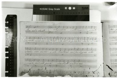 Ao longo do reverso encontram-se as seguintes inscrições a tinta: "Rolo 46; n.º 33; Proc. Rest.; ano: séc. XIX - estreia absoluta em Lx. - 1804; Ópera Camilla - MMS.XIX.012; pág. 200 (scena 6); Antes do restauro".