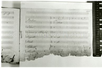 Ao longo do reverso encontram-se as seguintes inscrições a tinta: "Rolo 46; n.º 36; Proc. Rest.; ano: séc. XIX - estreia absoluta em Lx. - 1804; Ópera Camilla - MMS.XIX.012; pág. 221 (scena 8); Antes do restauro".