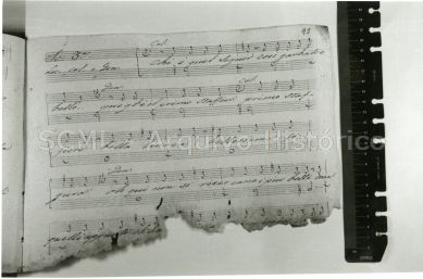 Ao longo do reverso encontram-se as seguintes inscrições a tinta: "Rolo 46; n.º 28; Proc. Rest.; ano: séc. XIX - estreia absoluta em Lx. - 1804; Ópera Camilla - MMS.XIX.012; pág. 95 (scena 3); Antes do restauro".