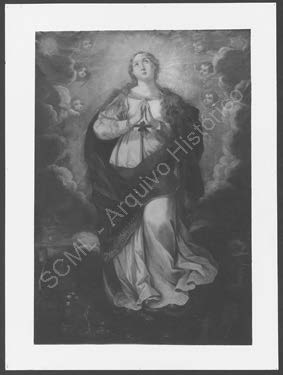 Reprodução da pintura a óleo sobre tela, com a representação da imagem de Nossa Senhora da Conceição elevando-se nos céus, rodeada por anjos. Atribui-se a autoria desta obra a Manuel José Gonçalves.
