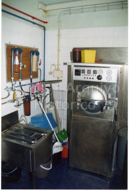 Enquadramento que pretende destacar um autoclave, junto do qual se observa uma pia de inox com grelha.