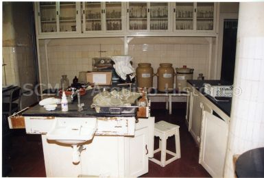 Em segundo plano, observa-se uma parede alta, junto da qual se vislumbram três reservatórios de água destilada e parte de um autoclave, colocados sobre uma banqueta e debaixo de um armário superior.