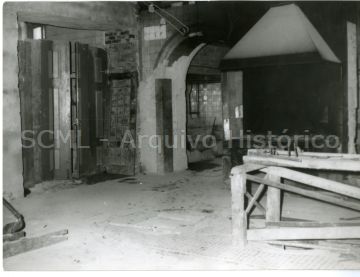 Vislumbram-se paredes destruídas e andaimes de madeira.