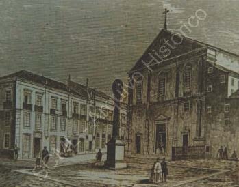 Reprodução de uma gravura do Largo de São Roque, atual Largo Trindade Coelho, junto à fachada principal da Igreja de São Roque, nos finais do século XIX.