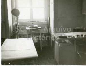 Destacam-se, em primeiro plano, uma mesa de trabalho, uma cadeira e uma maca.