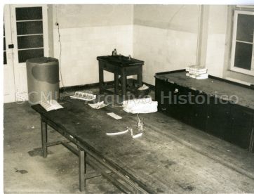 Pormenor de uma mesa de madeira e de um conjunto de armários, colocados junto de uma parede.