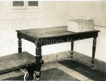 Pormenor do canto de uma sala, no qual se vislumbra uma mesa de madeira e um carrinho de transporte.