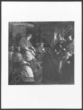 Pormenor da pintura a óleo sobre tela, da autoria de José de Avelar Rebelo, que representa São Francisco Xavier obtendo a aprovação do Papa Paulo III, quando da partida do santo para a Índia em 1541.