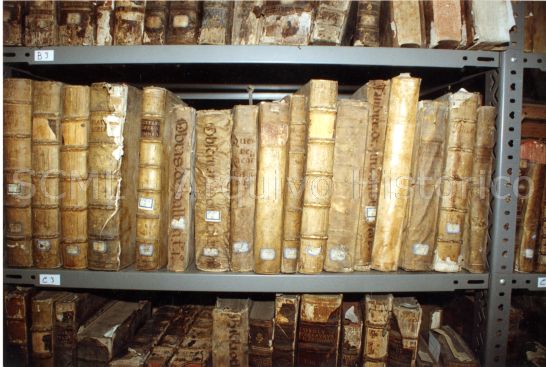 Pormenor de um conjunto de livros da coleção da Biblioteca do Marquês de Alegrete, acondicionados numa estante das instalações do Arquivo Histórico, sitas na Avenida D. Carlos I, em Lisboa.