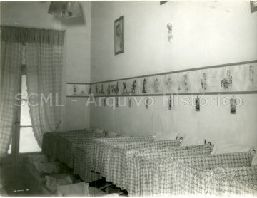 Enquadramento que pretende destacar vários berços alinhados, junto a uma parede.