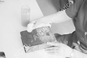 [Plano de pormenor de uma etapa do processo de higienização de uma encadernação]