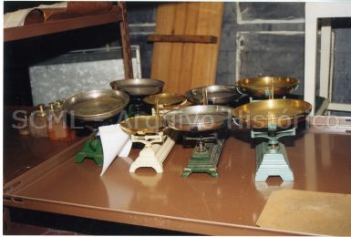 Destacam-se, no centro da imagem, quatro balanças de pratos, em latão e ferro, dispostas em fila.