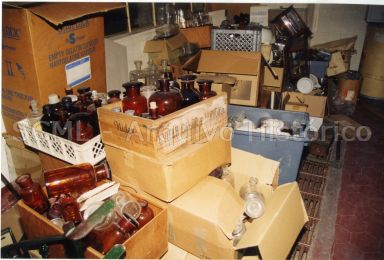 Enquadramento de parte de uma sala, onde se observam, depositadas sem ordem aparente, diversas caixas de madeira, plástico e cartão, contendo vários utensílios utilizados pelos serviços farmacêuticos.