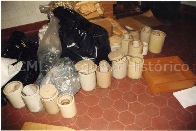 Pormenor do chão de uma sala, no qual se observam diversos sacos e caixas de madeira e cartão, destacando-se, em primeiro plano, vários boiões vazios.