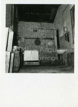 Enquadramento de parte do armazém, no qual se destacam alguns barris de madeira no chão, um lavatório e um extintor, colocados na parede.