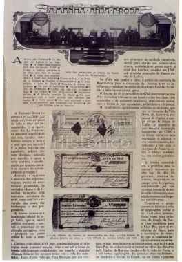 Enquadramento geral da página n.º 709 da revista "Ilustração Portuguesa", n.º 45, publicada em 31 de Dezembro de 1906, no qual se destacam três fotografias com a representação de três bilhetes de lotaria e de um plano geral da sala de extrações da Santa Casa da Misericórdia de Lisboa.