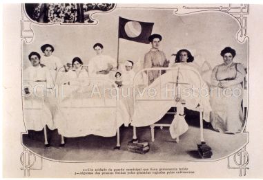 Enquadramento de parte da página n.º 514 da revista "Ilustração Portuguesa n.º 245, publicada em 31 de Outubro de 1910, no qual se destaca um retrato de grupo na enfermaria da Santa Casa, com as vítimas dos tumultos ocorridos na madrugada de 5 de Outubro do referido ano, em Lisboa.