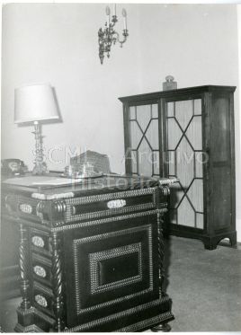 Observa-se uma mesa em madeira trabalhada, um armário fechado e, na parte superior da imagem, destaca-se um candeeiro embutido na parede.