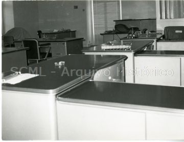 Enquadramento de uma sala com várias mesas de trabalho, sobre as quais se vislumbra diverso material de escritório.
