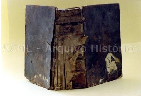 Observa-se a falta do revestimento externo da lombada e perfurações na capa.