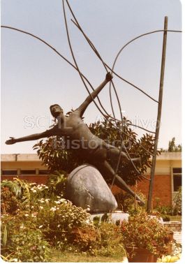 Observa-se, em primeiro plano, uma estátua de bronze da autoria do escultor Martins Correia.