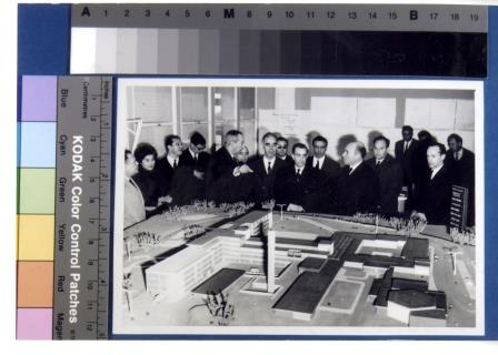 Observa-se uma fotografia colocada sobre um fundo azul e enquadrada por escalas de contraste e gradação da cor, representando uma visita de várias individualidades à maquete do Centro de Medicina e Reabilitação do Alcoitão.