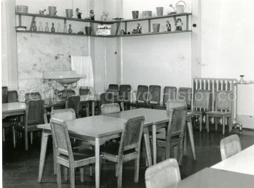 Enquadramento de parte do mobiliário de uma sala de aula. Destacam-se, embutidos numa das paredes, um lavatório e uma torneira.