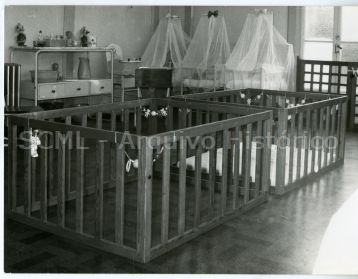 Em segundo plano, vislumbram-se três berços, cobertos com rede mosquiteira.