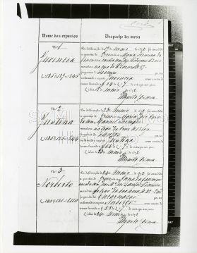 Ao longo do reverso encontram-se as seguintes inscrições a tinta: "Rolo 2; Negativo 29A; CE/EP/004/Lv.001; Estampa 52 - Entrega de expostos de seco aos pais com gratificação - Livro 1, fólio 1".