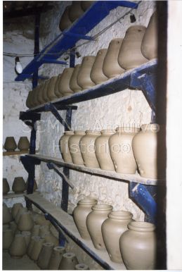 Observam-se várias peças de barro, dispostas em prateleiras, junto de uma parede.