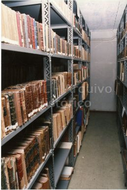 [Plano geral de dois corpos de estantes nas instalações do Arquivo Histórico da Santa Casa da Misericórdia de Lisboa]