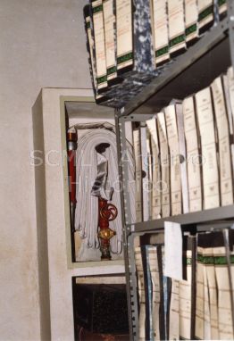 [Plano geral de um corredor de estantes nas instalações do Arquivo Histórico da Santa Casa da Misericórdia de Lisboa]