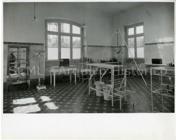 Enquadramento de uma sala, no qual se destacam armários, uma balança e diverso material clínico.