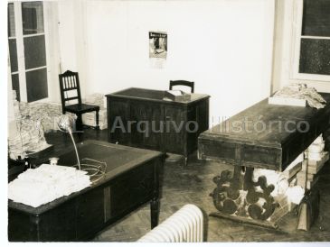 Observam-se várias mesas de trabalho, sobre as quais de encontram conjuntos de bilhetes de lotaria.