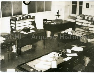 Vislumbram-se várias mesas de trabalho e estantes, sobre as quais se observam bilhetes de lotaria agrupados.