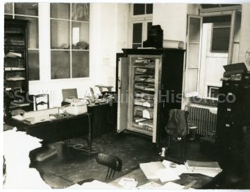 Observam-se duas mesas de trabalho, uma estante, parte de um ficheiro e um cofre.
