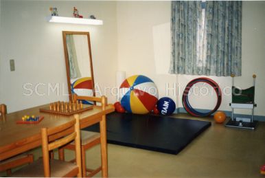 Enquadramento de parte da sala, onde se destacam mesas, bolas, arcos, um colchão e peças de jogos didáticos.