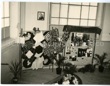 Enquadramento de parte de uma sala, no qual se destacam dois placards expositivos com trabalhos manuais efetuados por idosos.