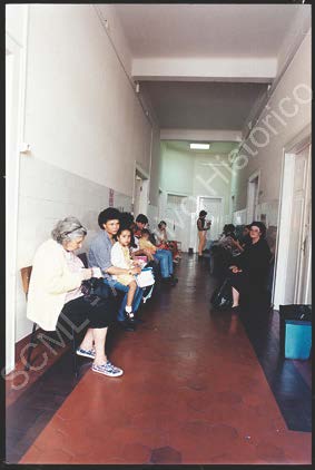 Distinguem-se, em primeiro plano, os utentes a aguardar por consulta médica, num dos corredores de acesso aos serviços de ambulatório do Centro Policlínico Central.
