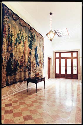 Distingue-se, em primeiro plano, uma parede adornada por uma tapeçaria da coleção de têxteis do Museu de São Roque de Lisboa (n.º de Inv. MT 228), onde se encontra representada uma oferenda ao Deus desconhecido. Destacam-se ainda um candeeiro e um vitral, com a inscrição do ano de criação da Misericórdia de Lisboa (1498).
