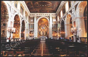 Distinguem-se, em primeiro plano, a zona dos fiéis, o altar-mor e as capelas laterais.