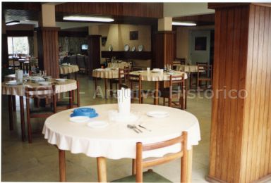 Plano da sala, onde se destacam diversas mesas redondas, preparadas para a refeição.