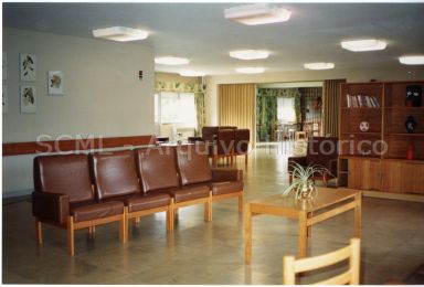Enquadramento geral de uma sala de convívio, onde se destacam cadeirões, mesas e estantes.
