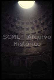 Observa-se o interior de uma cúpula de caixotões de betão, encimada por um óculo.