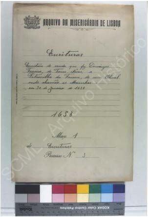 Reprodução da capa de arquivo do processo n.º 3, maço n.º 1 de escrituras do Cartório da Santa Casa da Misericórdia de Lisboa.