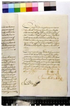 Ao longo do reverso, encontram-se as seguintes inscrições: "Certidão da verba do testamento de D. Violante do Canto / n.º 55 / Maço 5 / fólio 2 recto / CD 77 / imagem 4 / Antes do restauro".