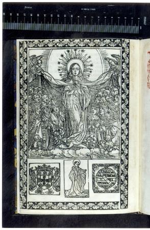 Destaca-se a gravura de Nossa Senhora da Misericórdia, sobre outras três imagens, que representam, da esquerda para a direita, o escudo de Portugal, a figura de São Pedro e uma esfera armilar.