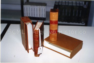 [Pormenor de exemplares de livro antigo, colocados sobre o tampo de uma mesa]