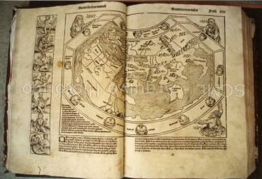 Plano do livro aberto, no qual se destaca uma gravura com a representação de um mapa do mundo.